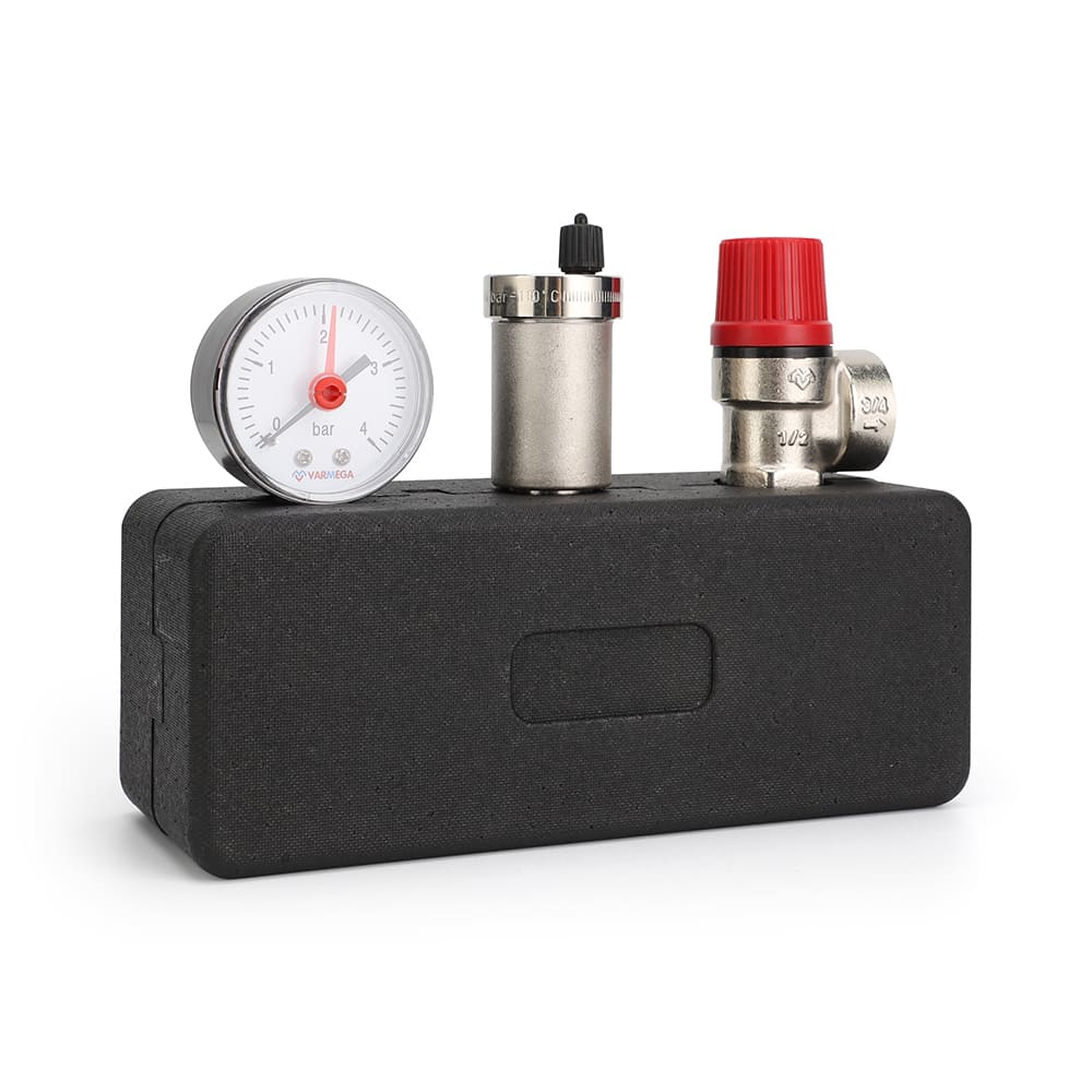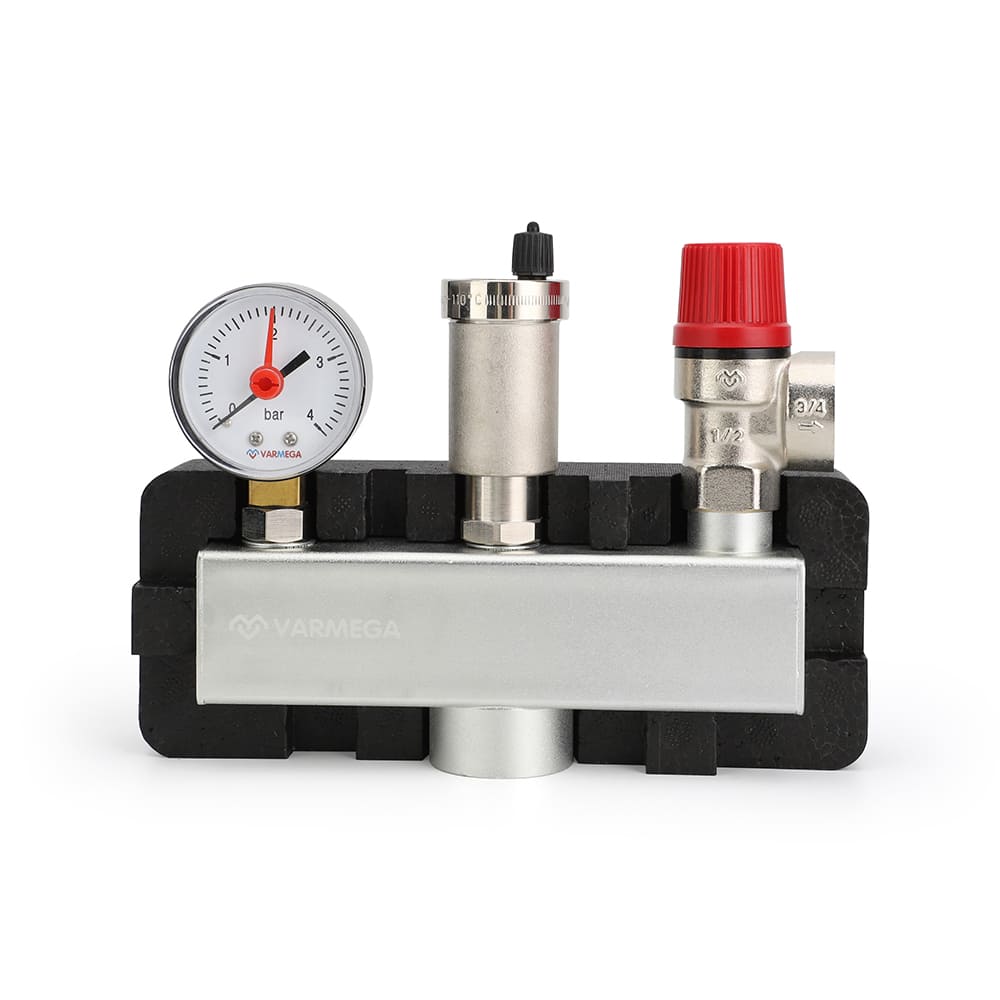 Группа безопасности котла Varmega применяется в закрытых системах водяного отопления для защиты от превышения максимально допустимого рабочего давления и отвода воздуха.